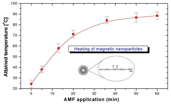 An example of the heating curve of the fluidMAG-OS suspension is shown in Figure 5. For sodium oleate fluidMA-OS (diameter 50 nm) with a concentration of 25 mg·mL−1, the increase in temperature is rather fast, with a temperature of 90 °C being achieved in 1 h. In the control experiments, heating of the sample without magnetic nanoparticles was found to be negligible. To avoid higher temperatures, the maximal concentration of magnetic nanoparticles used in all experiments was 2 mg·mL−1.