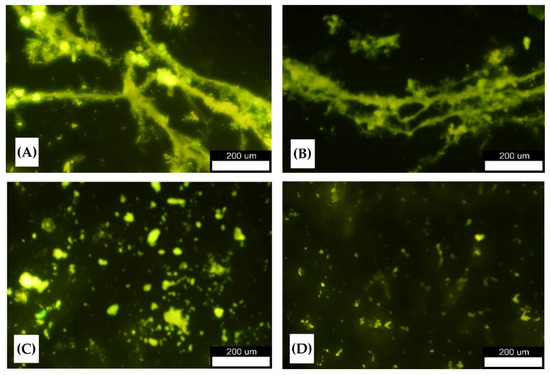 Representative images of lysozyme fibrils produced by ThT staining under the fluorescence microscope after the application of AMF for 15 min: (A) pure preformed fibrils without MN, (B) fibrils with 0.5 mg/mL of MN, (C) fibrils with 0.9 mg/mL of MN, and (D) fibrils with 1.3 mg/mL of MN. Scale bars: 200 μm.