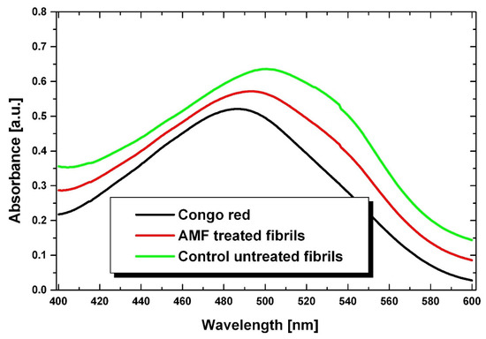Absorbance of fibrils stained with Congo red. AMF-treated fibrils corresponding to the presence of 0.9 mg/mL of magnetic nanoparticles.