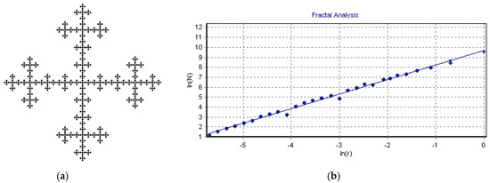 Determination of the fractal dimension: (a) Picture of Vicsek fractal; (b) Fractal dimension can be calculated as a slope from this linear log-log plot produced by HarFA software: log(N) = 1.463 × log(r).
