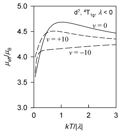 The impact of the lowest terms on the magnetic properties can be visualized by plotting the effective magnetic moment against the (reduced) temperature as displayed in Figure 4. The Griffith–Figgis theory working in the space of 12 spin–orbit kets |L = 1, ML, S = 3/2, MS> allows a comparison of three cases [25]. (i) The case of a perfect octahedron (rather hypothetical due to the Jahn–Teller effect), with the ground term 4T1g for which ν = 0, displays a round maximum at the μeff vs. kT/|λ| curve. (ii) With ν > 10 (the case of an elongated bipyramid), the maximum is much reduced and the high-temperature tail almost disappears for very negative Δax; then, the effect of the low-lying excited state 4A2g is filtered off and the magnetic properties are dominated only by the eight members (4 KDs) originating in the 4Eg term. (iii) For ν < 10, the ground term is orbitally non-degenerate 4A2g and the μeff curve falls down at low temperature due to a depopulation of δ3,4 vs. the ground multiplet δ1,2. The high-temperature tail is represented by a straight line, reflecting some temperature-independent paramagnetism. The situation is well described by the SH formalism when Δax is not too small.