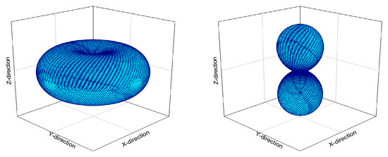 The 3D model of magnetization M(x,y,z) within the zfs model at T = 2.0 K and B = 1.0 T. Left—for D = +20 cm−1 (easy-plane magnetism); right—for D = −20 cm−1 (easy-axis magnetism).
