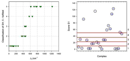 The set of critical parameters involves the norm of the projected state for the first Kramers doublet N(KD1), the smallest g-tensor component g1, the separation of the two subsets of KDs [E(KD3) − E(KD2)], and the first transition energy at the NEVPT2 level 4Δ1 (scaled to smaller numbers). Values of S1 > 50 refer to class 5—fulfilled; S1 < 10 span class 1—invalid. Limiting value for the fulfillment is S1 = 0.7 × 1.9 × 600 × 600/10,000 = 48. The above parameter can be extended by considering the mixing of the spin states: S2 = S1 × P/100 where P—percentage of the greater portion of spins | ± 1/2> or | ± 3/2> in the first KD (ideally p > 70).