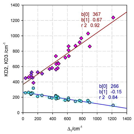 In some cases, the compound contains two crystallographic independent complex units. The ab initio calculations were performed for each of them. Some compounds contain identical or similar structural units. In the series [Co(dppmO,O)3][Co(NCS)4] (J), [Co(dppmO,O)3][CoBr4] (K) and [Co(dppmO,O)3][CoI4] (L) with the chromophores {CoO2O’2O”2}, the values of Dstr vary as −1.65, −1.45, and +2.15 pm; [Co(dppmO,O)3][CoCl4] (U) has a different symmetry of the chromophore {CoO3O’3}. The complex [Co(pydm)2](dnbz)2 (O) is analogous to [Co(pydm)2](mdnbz)2 (P), but differing in Dstr = −20.1 and −17.9 pm. Finally, [Co(bzpy)4Cl2] (F) contains two crystallographic different units with Dstr = +7.05 and −3.5 pm.