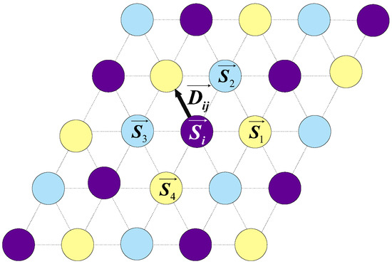 where is a classical unit-length Heisenberg spin at the ith site, is the AFM exchange coupling constant, h is the external magnetic field applied perpendicular to the lattice plane (along the z direction) and denotes the sum over nearest-neighbour spins. is the DMI vector whose orientation is defined by the crystal symmetries. In this study, we chose to point along the radius vector between two neighbouring sites, i.e., (Figure 1), which results in the formation of Bloch-type skyrmions. The magnitude of the parameter D defines the strength of the DMI. The presence of nonmagnetic impurities is simulated by randomly replacing a certain percentage p of spins on the lattice with vacancies. In the following, we set to fix the energy scale and absorb the Boltzmann constant in temperature by setting its value to .