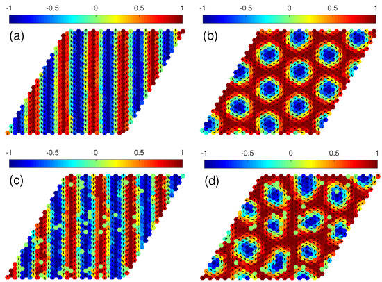 To simulate the presence of nonmagnetic impurities in our system, we randomly replaced of the sites with vacancies and studied their effect on the HL and SkX states. In Figure 2, we present the respective states in the pure system (a,b) and with of nonmagnetic impurities (c,d) on one of the three interpenetrating sublattices in the HL phase (a,c) and the SkX phase (b,d). The snapshots for one of the running replicas are shown. We can observe that, compared to the pure systems, the presence of the vacancies naturally results in some distortion of the respective phases. Nevertheless, there are no signs of the formation of bimerons, as was the case in the FM model [37]. We believe that the present AFM system is more resilient against the creation of bimerons than the FM one due to the fact that both HL and SkX textures are formed on each of the three interpenetrating sublattices. Therefore, for example, the stripe domain structures in the HL state are more robust and it is more difficult for nonmagnetic impurities to break them into pieces (bimerons) than in the FM system. Naturally, with the increasing concentration of impurities, the HL phase will eventually become distorted as well. Nevertheless, in comparison with the SkX phase, it appears slightly more robust against the impurities. We speculate that it might be due to the fact that, in the HL phase, the spins in similar states form compact bands that stretch across the entire lattice. On the other hand, the skyrmions are more vulnerable since they are isolated from each other and, as described below, their edges tend to conform to locations of vacancies.