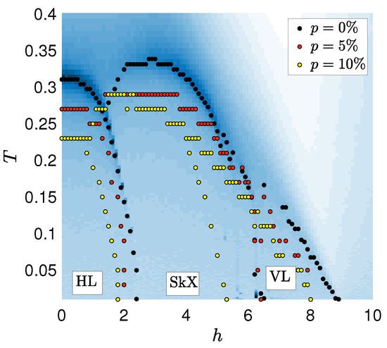 The phase diagrams for (red circles) and (yellow circles) are presented in Figure 3. Their overall topology remains unchanged as compared to the case of the pure model and consists of the HL phase in the low-field region, the VL phase in the high-field region and the SkX phase sandwiched between them. However, a tendency of the SkX phase to shrink and smear with the increasing number of impurities can be noticed. Nevertheless, the area of the SkX phase still occupies a big part of the phase diagram even for .