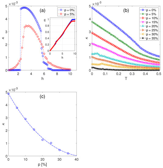 In Figure 4, we plot field and temperature dependencies of the chirality for selected values of the concentration of nonmagnetic vacancies p. The presence of impurities leads to a distortion of the skyrmion profiles and, consequently, a reduction in the magnitude of the chirality. At the same time, it smears out its abrupt change, particularly at the HL-SkX phase transition, with smaller but finite values within the higher-field part of the HL phase (see Figure 4a). The effect of the chirality reduction with the increasing concentration of the nonmagnetic impurities is also demonstrated in Figure 4b, in which the chirality is plotted versus temperature for a wide range of concentrations p. A similar effect of distortion of the skyrmion profiles and a reduction in the chirality is also produced by thermal fluctuations.
