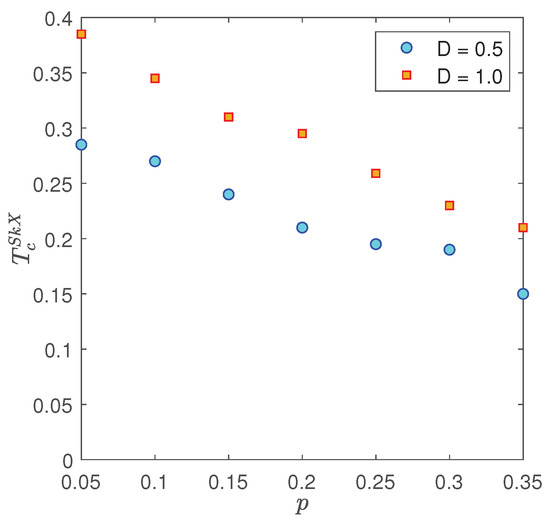 There are some suggestions that the value of may change with D. It is known that for the pure case, the transition temperature from the SkX to P phase increases with the increase in D [22]. If this relation also holds for the diluted model, then the SkX phase may survive to larger values of p if the DMI is increased. In Figure 5, we plot the SkX-P transition temperatures as functions of p for and 1. The values are just rough estimates, obtained for a finite-size system based on the specific heat maxima positions, and thus the phase diagrams should be read rather qualitatively. Moreover, with increasing p, the peaks become smeared, and for they are difficult to localize. Nevertheless, it is apparent that within the whole range of , and thus it is quite possible (but not inevitable) that .
