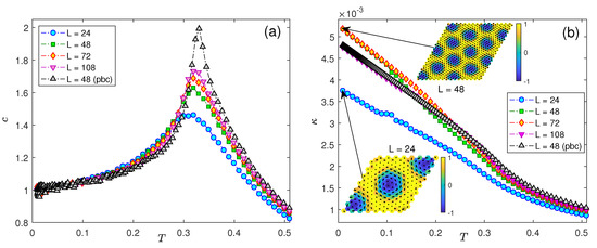 In Figure 6, we present the temperature dependencies of the specific heat for , and various lattice sizes with OBC, including the case of with PBC. One can see that the maxima signifying the phase transitions to the SkX phase are still present, albeit OBC make them lower and rounder when compared to those with the same size but PBC. Naturally, the increasing L tends to diminish the differences, since in the limit of , the boundary conditions become irrelevant. The finite values of the chirality as well as spin snapshots in the low-temperature region clearly showing the presence of skyrmions (the chirality due to lattice finiteness remains finite even at higher temperatures, however there are no skyrmions) (see Figure 6b) corroborate our expectations that the area below the peaks in the specific heat curves corresponds to the SkX phase. It is interesting to see a relatively large scatter of the saturation values of the chirality achieved at the lowest temperature for different L. The differences, apparently, result from the (non)commensurability of the total number of skyrmions and the lattice size. Namely, the chosen parameters and generate skyrmions of some characteristic size [22], which try to fill the entire lattice in the hexagonal arrangement. Considering these constraints, smaller lattices are rather rigid and may only allow the formation of a very small number of skyrmions (see the snapshot for ), while larger sizes are more flexible and can accommodate a much greater number of skyrmions (see the snapshot for ). However, with the increase in L, the saturation values seem to converge to some common value corresponding to the case of , partially emulated by imposing PBC.