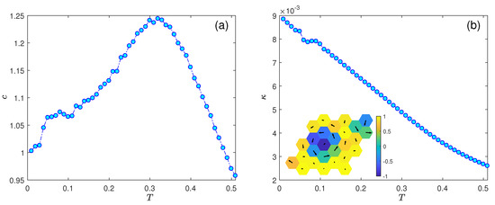 where is the chirality of a triangular plaquette of three neighbouring spins (area of the triangle spanned by those spins) and denotes the thermal average. The chirality is calculated for the whole lattice and the summation runs through all the spins with corresponding to and in Figure 1. Spins are taken in a counter-clockwise fashion to keep the sign in accordance with the rules in [43].