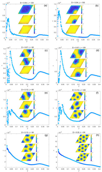 In the systems with PBC, the presence of skyrmions was confirmed down to for and extrapolated to for [22]. Apparently, for finite clusters, much larger values of DMI are required to stabilize the SkX phase. Figure 8a demonstrates that for , the clusters of the size do not undergo the transition from the up-up-down to the SkX phase, as we witnessed in the PBC systems, but remain in the up-up-down state. Upon increase in either L (Figure 8b) or D (Figure 8c), there is a crossover to a peculiar state with one spin-up sublattice and two sublattices, each including rather large spin-up and spin-down domains. The increase in the cluster size to at the same results in the extension of the domain-like structure to all three sublattices (Figure 8d). These domains resemble fractions of deformed skyrmions; however, the total chirality remains close to zero. Further increase in D and L (Figure 8e,f) leads to the appearance of whole skyrmion-like structures but they are still rather deformed and scattered on the respective sublattices. Only for and one can observe almost circular-shaped skyrmions showing more or less regular arrangements on the sublattices and the case of and looks already like a typical configuration in the SkX phase.