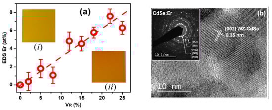 (a) EDS as a function of VR. Dashed line represents a linear fitting. (i) and (ii) insets illustrate images of the VR = 15% doped and undoped Cd1-xErxS samples, respectively. (b) TEM image of sample for x = 4.6 at%, where the (002) planes of wurtzite phase of CdSe are represented. The inset shows a SAED pattern of the WZ crystalline structure.
