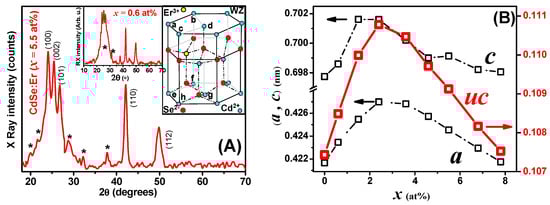 where d is the interplanar distance and (h, k, l) are the Miller indices. The ratio a, c and the unit cell volume (V) for pure and Er-doped samples are shown in Figure 2B. It can be noticed that a, c and V are affected by erbium doping with an increase in their values up to x = 2.4% with respect to the pure sample. This behavior of a, c and V may be attributed to changes in the ionic size of Er3+ (0.89Å) substituting Cd2+ (0.95Å) in CdSe lattice. a, c and V decrease for x > 2.4% and in the end, they approach the values of pure CdSe. This cell contraction may be explained by the larger Er3+ ions leaving the CdSe lattice at high doping concentrations (x > 2.4%) to form the Er2O3 impurity [80,81]. The decrease in the lattice parameter c may also be attributed to the formation of defects in the CdSe lattice as a result of increasing the number of dopant (Er3+) ions, Dakhel et al. reported similar behavior when performing a different doping experiment [82].
