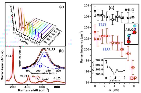 Raman spectra of Er-doped CdSe nanocrystalline thin films in 150–700 cm−1 intervals can be seen in Figure 3a. An inspection of the corresponding data shows an increase in the phonon signals as x increases. These observations are similar to those reported by Portillo et al. [60]. A Raman spectrum of a representative CdSe:Er sample is exhibited in Figure 3a, where three overtones are observed in addition to the optical longitudinal A1LO mode at 205 cm−1 of the WZ CdSe structure. A Raman phonon mode for the monoclinic structure of Er2O3 at ~560 cm−1 can also be seen in the CdSe:Er spectrum of Figure 3b [61]. The 1LO phonon mode shows an asymmetric band, which reflects the presence of a surface mode [62]. In nanocrystals (NCs) this is mainly due to a high surface to volume ratio [63], surface-ions-bond contraction and quantum confinement [64]. Deconvolution of these signals separates the 1LO and the surface phonon modes (SPM), A and B, as shown in the inset of Figure 3c. The lower inset shows the 1LO mode in a magnified scale, where the frequency position as a function of x is clearly observed. This relationship resembles an inverse function of the CdSe UC versus x (see Figure 2B), in which lattice expansion implies phonon softening, and lattice contraction and phonon hardening. In the inset of Figure 3c on the other hand, it is possible to observe vibration displacements of the 1LO mode, which reflect bond-stretching vibrations [65]. As it was previously indicated, contraction or expansion of the CdSe lattice depends on the concentration of Er3+ impurities in the interstitial sites of the CdSe lattice. The B-data trend in Figure 3c indicates that the SPM shifts to lower frequencies when the doping increases; a fact that suggests that disorder augments almost monotonically as x increases [66,67].