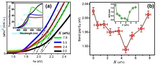 Figure 4a shows the Tauc method data used to calculate the CdSe direct energy band gap, Eg, in which the (αhν)2 versus hν plot was employed [68]. Here, α is the optical absorption coefficient, which was determined from the optical transmittance (To) (α = [Log{100/To}]/[τLoge]), hν is the photon energy; and only four samples are exhibited for clarity. The inset in this figure shows To spectra for the same four samples chosen for Eg calculation. Figure 4b displays Eg as function of x for the entire 0.0 ≤ x ≤ 7.8 at% range. The Eg dependence on x is in agreement with the UC vs. x plot, because, in general, if UC increases, Eg is reduced, and vice versa. However, this is not in agreement with the average crystal size (ACS) as function of x, since it can be readily seen that as ACS decreases, Eg also decreases. This is contrary to the quantum confinement effect since ACS should be within the strong quantum confinement regime (CdSe Bohr radius: 5.3 nm) [69]. This anomalous behavior can be explained considering the modifications in the lattice produced by the doping, which in turn can result in distortion, vacancies, interstitials, stress, expansion, contraction and non-stoichiometry effects, which can break the crystal symmetry and modify the physical properties of materials [70,71,72,73], particularly in the case of lanthanide doping [74]. The ACS dependence on x can be explained by surface tension increase that reduces crystal size when Er3+ bonds at the NC surface are formed [75,76]. It is also interesting to note that at x ≅ 4.6 at%, the effect of Er3+ on the NCs volume becomes important, and the ACS starts to increase. It can also be observed that the crystal size (Figure 4b green) behaves inversely to the unit cell size (Figure 2B red). We have obtained different values of Eg shown in Figure 4b red. Eg decreases with increasing erbium doping up to x = 4.6%, then it increases for x = 5.5 to 7.8%. The decrease in Eg may be due to the erbium electron localized states that create new states near the conduction band, leading to a reduction in the band gap of pure CdSe (similar observations were reported for ZnO) [77]. The variation in band gap depends also on particle size (Figure 4b green) and lattice parameters (Figure 2B). The decrease in particle size with increasing doping concentration leads to a rising of the band gap as the quantum refinement effect occurs [78]. The Bras’ effective mass model [79] can also explain our results. The energy gap (Eg) of the nanoparticles can be expressed, according to Bras’ effective mass model, as a function of particle size, as shown by the following expression: