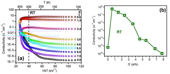 Figure 5a shows the dark d.c. conductivity (σ) dependences (presented on a semi-logarithmic scale) of Cd1-xErxSe, in the 10−7 to 101 Ω−1 cm−1 range, versus the inverse of the absolute temperature (T) times k (1/kT). Here, k corresponds to the Boltzmann constant. A metallic behavior of log (σ) vs. 1/kT is observed for x = 0.6, 1.5 and 2.4 at%, since σ remains essentially constant in the 300 ≥ T ≥ 35 K range (which is 35 ≤ 1/kT ≤ 110 (eV)−1), and decreases for T ≤ 35 K. For 3.6 ≤ x ≤ 7.8 at%, the behavior is that of a semiconductor with shallow donor levels, where the free carrier density decreases as x increases. The metallic dependence of log (σ) vs. T has been observed in ITO films grown by reactive plasma [83], and has been attributed to disorder in the lattice. Grenberg and coworkers [84] also reported a similar behavior at low temperatures for ZnO nanocrystals (NCs), which was obtained by changing the contact area and the center-to-center distance between NCs. A strong decrease in free carriers’ lifetime has been reported when the Er concentration increases, due to the formation of NCs [85,86].
