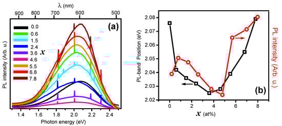 (a) Photoluminescence spectra of all the set of Cd1-xErxSe samples. (b) Energy position of the PL band maximum (left axis) and PL band intensity (right axis) versus x.