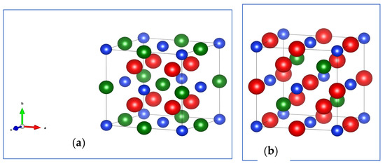 Crystal structures of Sc2TiAl and Sc2TiSi in (a) regular Heusler (L21) and (b) inverse Heusler (Xa) (Red: Sc, Green: Ti, Blue: Al/Si).
