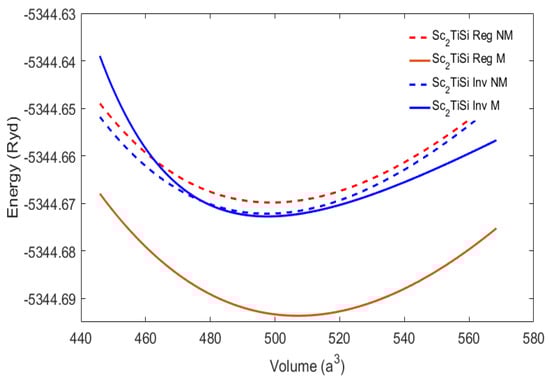 The total energy (Ry) versus volume (a.u3) of non-magnetic, regular, and inverse Sc2TiSi Heusler.