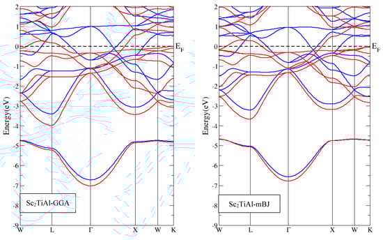 In this section, we investigated both the partial and total density of states (PDOS, TDOS) and the band structure (BS) for both Sc2TiAl and Sc2TiSi alloys. Since the regular L21 cubic structure is the ground state, we will focus on the regular L21 electronic structure. The analysis of the BS for regular Heusler structures of Sc2TiAl and Sc2TiSi showed that they exhibited metallic behavior for both spin-up and spin-down within the GGA-PBE and mBJ-GGA methods, with zero-energy gaps, as shown in Figure 4.