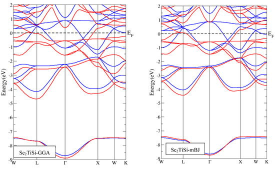 Calculated band structure for regular Sc2TiAl and Sc2TiSi using GGA and mBJ (blue lines for spin-up, red lines for spin-down).