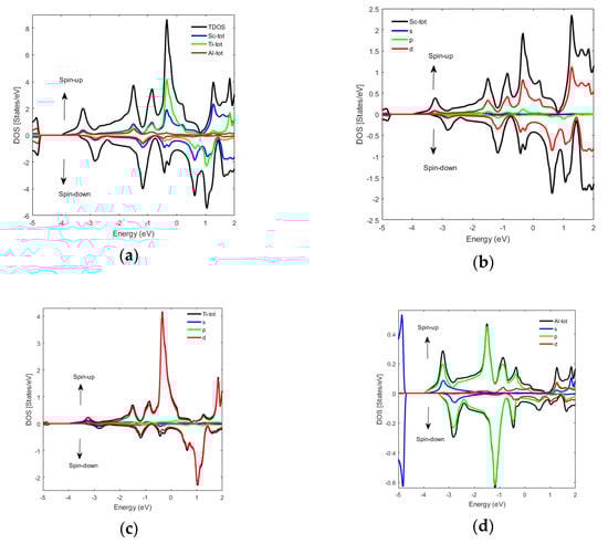 In the spin-up regular Sc2TiAl (Figure 5), the main contributions to the valence band (VB) and conduction band come from the Sc-d state, the Ti-d state, and both the s- and p-states of Al. The main contributions come from the Ti atom, then the Sc atom, and then a small contribution from the Al atom in this compound. In addition, the main contributions to the conduction band come from the Sc-d state, the Ti-d state, and the s- and p-states of Al, with the main contributions coming from the Sc atom, then the Ti atom, and then a small contribution from the Al atom in this compound. In spin-down of regular Sc2TiAl (Figure 5), the main contributions to the valence band come from the Sc-d state, the Ti-d state, and the s- and p-states of Al, with the main contributions coming from the Sc atom, then a small contribution from the Al atom, and then the Ti atom in this compound. The main contributions to the conduction band come from the Sc-d state, the Ti-d state, and the s- and p-states of Al, with the main contributions coming from the Sc atom, then the Ti atom, and then a small contribution from the Al atom in this compound.