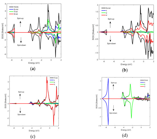 In the spin-up and spin-down states of regular Sc2TiSi (Figure 6), the Sc-d and Ti-d states, as well as the s- and p-states of Si, make the main contributions to the valence and conduction bands.