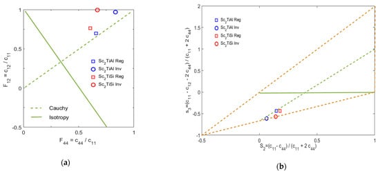 Blackman’s and Every’s diagrams are used due to their efficiency in comparing the elastic properties of cubic materials. These diagrams correlate dimensionless quantities that are related to ratios of different moduli. Figure 7 summarizes the results of this study in such diagrams. Blackman’s diagram compares to , while Every’s diagram is more complicated. It compares as a function of . Materials with s3 = 0 are isotropic, and the two quantities, s2 and s3, are related to the elastic waves. Since c44 > 0, then F44 > 0, whereas F12 is restricted to −0.5 < F12 < 1. These are the restrictions for Blackman’s diagram, and all values within these ranges are allowed. In Every’s diagram, the values for stability are restricted to fall into the triangle with (s2, s3), equal to (−0.5, −1)–(1, 0)–(1, 1.5), as shown in Figure 7. It is noticed that the studied compounds in this study were below the isotropy line, where s3 = 0 [19].