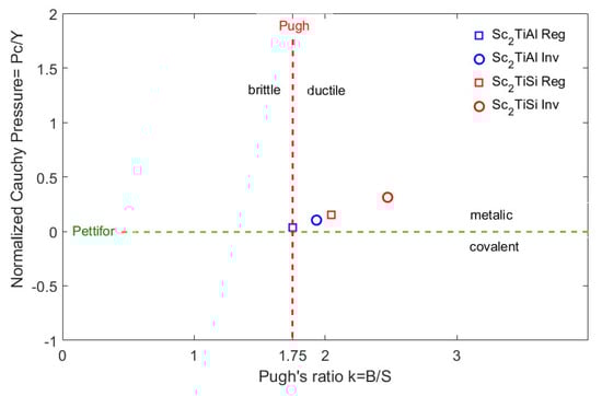 All studied compounds were classified as ductile and metallic materials, except the regular compound of Sc2TiAl (k = 1.7), which lay slightly to the left of the vertical line between brittle and ductile. Therefore, it was considered a brittle compound.