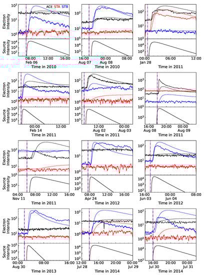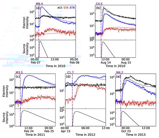 - Dröge, W.; Kartavykh, Y.Y.; Dresing, N.; Heber, B.; Klassen, A. Wide longitudinal distribution of interplanetary electrons following the 7 February 2010 solar event: Observations and transport modeling. J. Geophys. Res. (Space Phys.) 2014, 119, 6074–6094. [Google Scholar] [CrossRef]