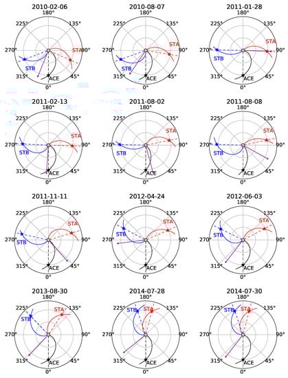 - Richardson, I.G.; Von Rosenvinge, T.T.; Cane, H.V.; Christian, E.R.; Cohen, C.M.S.; Labrador, A.W.; Leske, R.A.; Mewaldt, R.A.; Wiedenbeck, M.E.; Stone, E.C. >25 MeV Proton Events Observed by the High Energy Telescopes on the STEREO A and B Spacecraft and/or at Earth During the First ∼Seven Years of the STEREO Mission. Sol. Phys. 2014, 289, 3059–3107. [Google Scholar] [CrossRef]
