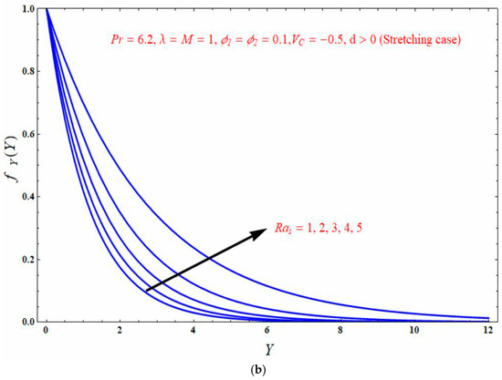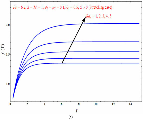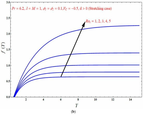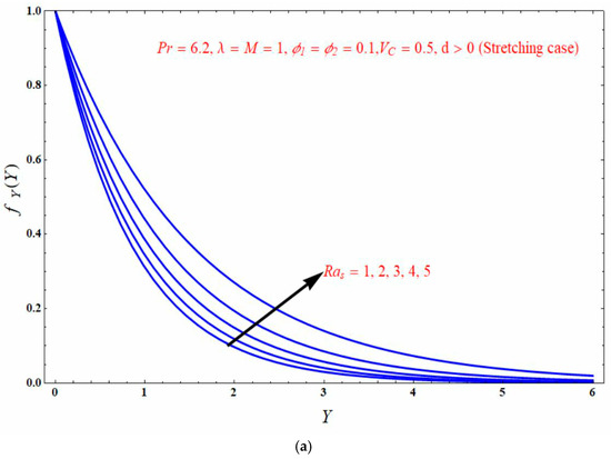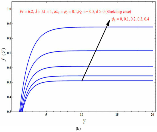 Figure 4a,b represent the impact of as a function of for varying the values for both and cases, respectively. Here, the axial velocity is incresed for increasing values for both and cases.