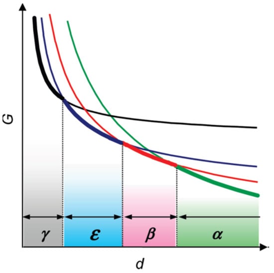 Representation of free energy G vs. particle diameter d curves for the four Fe2O3 phases. Gray, blue, green and red lines represent the G values of γ-, ε-, β- and α-Fe2O3, respectively. Thick solid lines indicate the most stable Fe2O3 phases over the corresponding size ranges. Copyright 2009 by the American Chemical Society. Reprinted with permission from [].