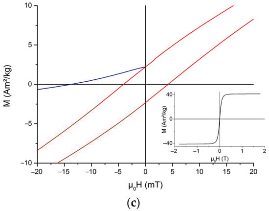 Static magnetic properties of various samples of silica–iron oxide systems: (a)—Hysteresis loop and backfield demagnetization curve of a sample containing ε-Fe2O3. Reprinted from [], license CC BY 4.0; (b)—Magnetic hysteresis curve of FemOn-SiO2 synthetic colloidal nanoparticles. Reprinted from [], with permission from Elsevier; (c)—Backfield curve and central part of the hysteresis loop of magnetite ore powder; full loop in the 1.8 T maximum field is shown in the inset. Reprinted from [], with permission from Elsevier.