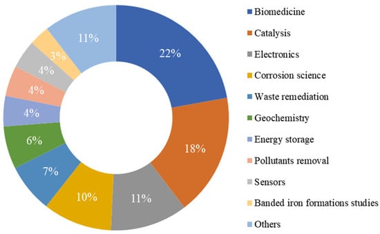 The most stable (under normal conditions) iron oxide compound, hematite, attracts the highest attention of scientists, according to the overall amount of published papers (Table 4). Similarly to magnetite, the most frequently obtained form of α-Fe2O3 is a chemically synthesized NP, predominantly used for photocatalysis, biogeochemistry and the bioremediation of toxic compounds [,,,,,,,,,,,,,,]. The second important form of hematite is the natural ore with inclusions of α-Fe2O3, which is used in Earth sciences [,,,,,,,]. The use of the pure γ-Fe2O3 is quite rare. The most frequently produced form of γ-Fe2O3 is as NPs (Table 5), including chemically synthesized [,,,,] or biogenic [].