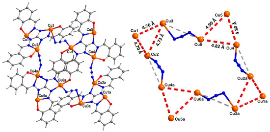 The asymmetric unit of Cu12 contains half of the molecule [{Cu3L(µ-N3)}2(Py)7]·Py (Figure S2). Each asymmetric unit contains two almost-planar C3-symmetric triangular fragments, which are bridged via Cu3 and Cu6 (6.11 Å) through azide anions (Figure 1, right and Figure S2). Finally, both asymmetric units are again node-to-node connected via Cu2 and Cu4 (5.95 Å) through azide anions to construct a dodeca-nuclear Cu12 metallacycle. In total, four two-connecting node-to-node connections via single azide bridges are provided by pairs of metal centers (Figure 1, right). Within each triangle, the tri-topic ligand leads to an approximately planar symmetrical triangular arrangement through the N−N diazine bridges among the copper centers. In Cu1 to Cu5, all five copper centers are five-coordinated, in which three equatorial coordination sites (NNO) are occupied by the tridentate pockets of the ligand, along with two trapped pyridine molecules for both the Cu1 and Cu5 centers to provide trigonal bipyramid (D3h) arrangements, while in the case of the Cu2 to Cu4 centers, the remaining two coordination sites are filled by one pyridine and one bridging azide anion to accomplish spherical square pyramid (C4v) geometries, respectively (Figure S3 and Table S3). Cu6 is the only metal ion that is four-coordinated and whose fourth position is occupied by the bridging azide anion in cooperating with the planar tridentate pocket (NNO) of the ligand, displaying a square planar (D4h) geometry (Figure S3). The distances within intra-triangular copper ions range between 4.70 Å and 4.90 Å (Figure 1 right). The Cu−N−N−Cu dihedral angles are almost linear, ranging from 147.32° to 177.97°. The calculated bond lengths and dihedral angles of Cu12 are very consistent with the reported spin-frustrated triangles, Cu3py and Cu3bpy [38,39].