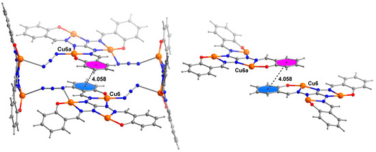 In addition, at first glance, an offset face-to-face π···π interaction may exist between the two perfectly parallel benzene rings of the ligands related by an inversion center (Figure 2, left), proved by the short distance of 4.06 (1) Å between the centroids of the benzene rings. Although the vertical distance of 3.36 (4) Å between them corresponds to the formation of a weak π···π interaction between the benzene rings, the planes of the two adjacent benzene rings hardly overlap with each other at all, seeing that the centroid shift distance of 2.26 (9) Å between the two benzene rings is almost equal to the centroid distance of 2.42 (1) Å between the two adjacent side-by-side benzene rings (Figure 2, right). Thus, there was nearly no π···π interaction in the Cu12 and a further negligible exchange interaction attached to the centers of Cu6 and Cu6a can be transmitted along this path.
