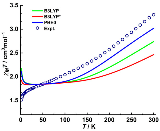 The calculated magnetic susceptibility obtained with the different density functionals and experimental data are reported in Figure 3. Between them, a relatively good qualitative agreement was reached for the high-temperature range. This resulted from a relevant determination of the strong antiferromagnetic intra-couplings (Jintra) between the CuII ions of the same triangular unit (Table S4). However, the couplings determined from the different functionals used in this work were not able to properly reproduce the trend of (χMT) in the low-temperature range. The magnetic behavior at low temperatures mainly resulted from the interactions between the triangular units through the cis or trans azido bridges. These (Jazido) couplings were determined as very weakly ferromagnetic, with values in the order of magnitude of the cm−1 (Table S4). This order of magnitude is basically the expected accuracy of the DFT BS evaluation. Hence, one may have some doubts about the ability of this level of theory to properly evaluate these couplings. In addition, the magnetic couplings between copper ions mediated by such end-to-end azido bridges have been deeply investigated in the literature and are expected to be weakly antiferromagnetic [71,72,73,74]. However, using higher levels of theory such as WFT-based methods is untractable regarding the size of the system considered here.