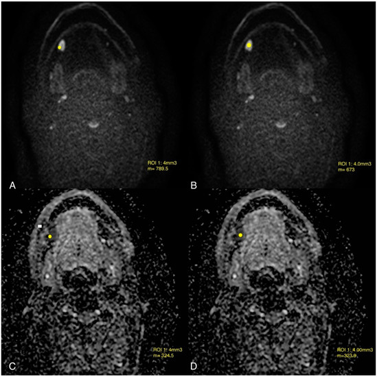 - Jović, A.; Fila, J.; Gršić, K.; Ivkić, M.; Ozretić, D. Diffusion-weighted MRI: Impact of the size of the ROI in detecting metastases in subcentimeter lymph nodes in head and neck squamous cell carcinoma. Neuroradiology 2020, 62, 987–994. [Google Scholar] [CrossRef] [PubMed]