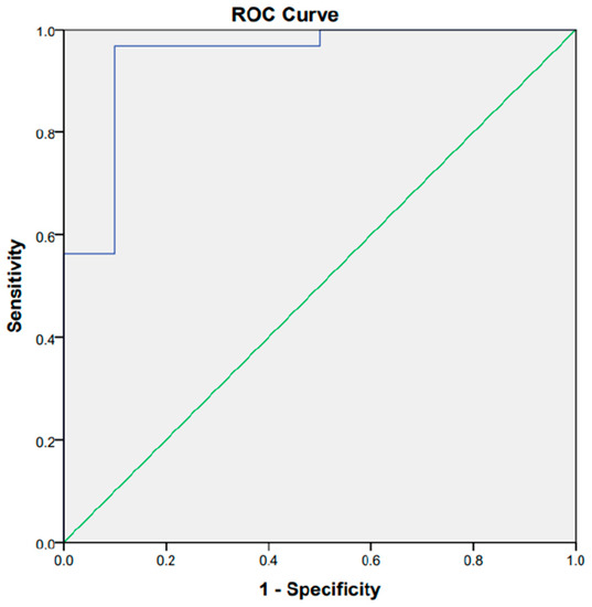 In the external validation, the significant parameters in the training population (Dmax and ROI.p.DWI) were evaluated using binary logistic regression analysis. The ROC curve generated from the logistic regression model had an AUC of 0.972 (95% CI: 0.904–1), indicating that the model had excellent discriminative power. The model had a sensitivity of 91.6%, specificity of 83.3%, and an accuracy of 88.8% (Figure 4).