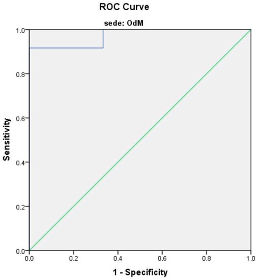 ROC curve was generated from the binary logistics regression. The blue line represents our discriminant ( Dmax and ROL.p DWI): AUC resulted to be 0.944. While the green line is the random classifier (AUC 0.5).