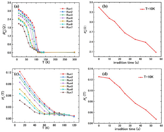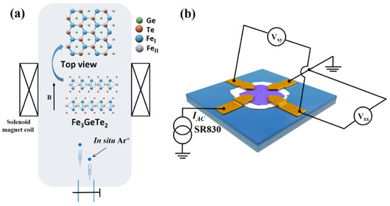 In this work, we report the tunable magnetic properties of argon-irradiated thin flakes of Fe3GeTe2. The exfoliation of thin flakes of Fe3GeTe2 on SiO2/Si substrates was assisted by the evaporation of Al2O3, as previously described [22]. Cr/Au (3 nm/70 nm) electrodes were evaporated onto the thin flakes of Fe3GeTe2 through stencil masks to avoid any possible degradation from the conventional lithography process. The fabrication process was conducted in a glovebox to preserve sample quality. Seven runs of argon ions irradiation were performed, and the transport properties of Fe3GeTe2 were studied in situ after each round using the lock-in detection technique. The simplified schematic of the in situ transport measurement setup is shown in Figure 1a, and the base temperature was maintained at 10 K. The argon ions generation was accomplished through a radio-frequency ions source with a working voltage of 2 kV and current of 20 mA. The irradiation time was in the range of 5–10 s for each run.