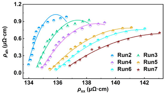 To gain further insight into the reduction of magnetism in Ar+ irradiated Fe3GeTe2, we employ fitting between and based on Equation (2) to determine contribution from different mechanisms. The longitudinal resistivity () is obtained by the relation of , where the d is the thickness of device and the L/W is the aspect ratio between the measured electrodes. The transverse resistivity () is derived according to the relation of . Wherein the () is the longitudinal (transverse) resistance after the standard symmetrization (anti-symmetrization) procedure [22,33]. Then the anomalous Hall resistivity () can be determined by extrapolating the high field (H > 1 T) part of back to zero field. The fitting results are shown in Figure 4 for data from the Ar+ irradiation run 2–7, which demonstrated the applicability of the TYJ scaling relation.