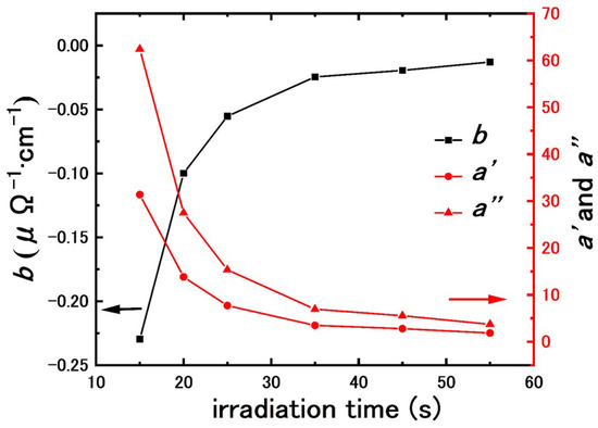 Next, we plot the fitting parameters , , and b with irradiation time as shown in Figure 5. First, it is obvious from the parameters that the skew scattering contribution dominates the anomalous Hall effect due to higher value. Moreover, the opposite sign between () and b indicates that the contribution between joint contribution from intrinsic Berry curvature as well as side-jump and skew scattering is opposite, which was also observed recently in pristine single crystal Fe3GeTe2 [41]. As irradiation time increases, the amplitude of ,, and b gradually decrease, especially in the range of the first 15–25 s, then tend to zero. This means that the defects generated by Ar+ irradiation can effectively reduce the skew scattering strength in Fe3GeTe2. Ar+ irradiation can also strongly reduce the combined effect of Berry curvature and side-jump scattering in the material. The overall effect is that the scattering in Ar+ irradiated Fe3GeTe2 becomes increasingly non-magnetic, which is an interesting observation, since the contribution from magnetic scattering reduces drastically when disorders are introduced.