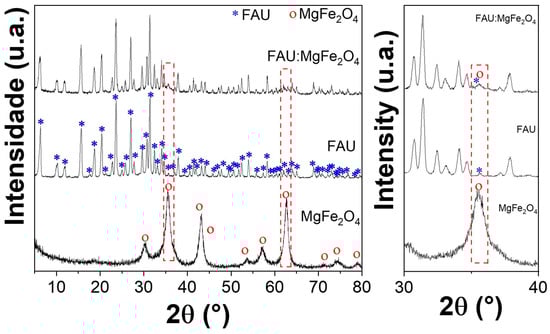 The synthesized zeolite showed characteristic peaks of the faujasite phase, according to the JCPDS data sheet 043-0168. For the synthesized MgFe2O4, all peaks correspond to the JCPDS number 71–1232. No additional peaks were observed. The results obtained by XRD evidenced the crystallinity and purity of the precursors for the nanocomposite production. In the FAU:MgFe2O4 (3:1) diffractogram, the FAU phase maintenance can be observed. Regarding the MgFe2O4 reflections, the FAU peak superposition makes it difficult to verify whether the ferrite phase was retained. However, the red highlights and the graph magnification (Figure 1 right) confirm the presence of the most intense MgFe2O4 peak in the composite. Thus, the presence of FAU and MgFe2O4 in the obtained nanocomposite is evident. Similar research on magnetic nanocomposites has shown the synthesis of MgFe2O4 nanocomposite without any structural change in the support. Hosseini et al. [] synthesized the nanocomposites of graphene oxide and MgFe2O4 and observed the phase maintenance of the precursors.