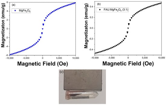 Magnetic curves were analyzed in order to understand the MgFe2O4 magnetic behavior (Figure 4). The results presented in Figure 4 show that MgFe2O4 presents 5.90 emu g−1 for saturation magnetization (Ms) and 0.10 emu g−1 for remaining magnetization (Mr). A similar result was obtained by Sheykhan et al. [] for MgFe2O4 synthesized via the coprecipitation method and calcined at 550 °C for 6 h. The authors observed a Ms value of 6.00 emu g−1 and Mr of 0.0008 emu g−1. Figure 4a shows the typical behavior slope for materials with soft magnetic nature, as widely reported in the literature [,,,]. The narrow shape of the curves also demonstrates that the material can be readily demagnetized, affirming its superparamagnetic nature []. When analyzing the FAU:MgFe2O4 (3:1) nanocomposite’s magnetic capacity, a decrease in Ms from 5.90 to 0.47 emu g−1 and Mr from 0.10 to 0.01 emu g−1 (Figure 4b) is observed. Paris et al. [] prepared Nb2O5:MgFe2O4 magnetic photocatalysts, obtaining a Ms of 3 emu g−1. This study showed a decrease in magnetization compared to pure magnetic material due to the content of magnetic nanoparticles in the composite. Su et al. [] studied the ZnO:MgFe2O4 (1:1) composite. A decrease in Ms from 40 to 20 emu g−1 for the ferrite in the nanocomposite form was observed. The reduction in the nanocomposite magnetic effect concerning isolated ferrite corresponded to the ratio used, which was equivalent to 25%. This result corresponds to the present work, since FAU zeolite in the nanocomposite consists of a non-magnetic component.