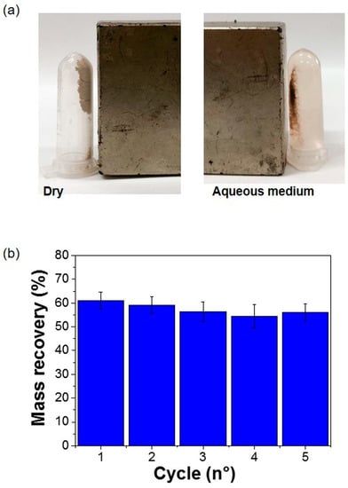 Concerning the nanocomposites, as observed in Figure 4, in terms of magnetic behavior, in the evaluated FAU:MgFe2O4 3:1 (w w−1) proportion, the weak properties and the low values contributed to the difficulty of complete separation in an aqueous medium. As seen in Figure 5a, the nanocomposite is attracted to the magnetic in dry form (Figure 5a (left)) and an aqueous medium (Figure 5a (right)). However, the nanocomposite in a 3:1 ratio (w w−1) does not allow the complete attraction of particles (turbidity), keeping it partially separated in suspension. The nanocomposite magnetic capacity was evaluated via mass recovery through five cycles using a neodymium magnet (Figure 5b). At the end of the first cycle, the weight decreased from 0.1 g to 0.039 ± 0.004 g, corresponding to around 60% recovery. It is noticed that the recovery percentage after the 1st cycle remained very similar until the fifth cycle. In the present system, FAU:MgFe2O4 at a ratio of 3:1 (w w−1) would be necessary to increase the proportion of magnesium ferrite in the nanocomposite for a better magnetical response. However, recovering approximately 60% of the adsorbent in the evaluated conditions is possible.