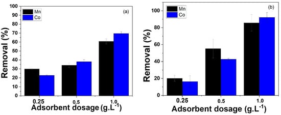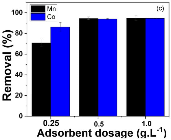 Concerning Figure 6, the adsorption test results showed that for a contaminant concentration of 10 mg L−1, the highest adsorption percentages are 94.5% and 94.9% for the Co2+ and Mn2+ ions, respectively, using a nanocomposite dosage of 1.0 g L−1.
