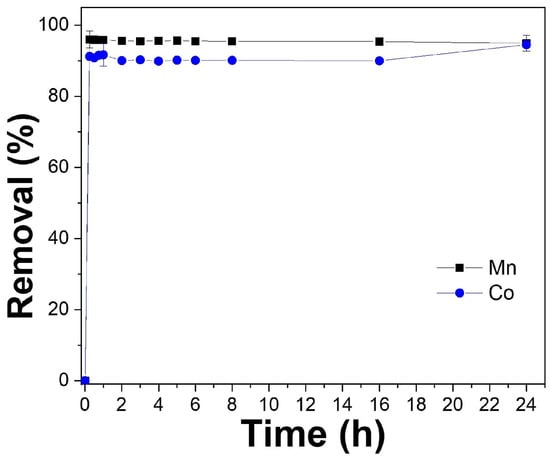 Under the evaluated conditions, the adsorption/desorption equilibrium is reached in the first 15 min (0.25 h) of contact between the adsorbent (FAU:MgFe2O4) and the adsorbate (metallic ions). For Mn2+ and Co2+, respectively, approximately 95% and 94% of these contaminants were removed, remaining constant until the end of the test.